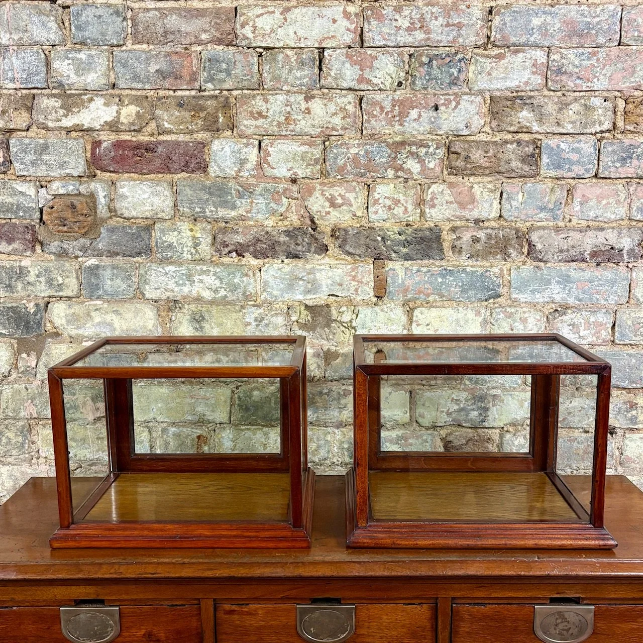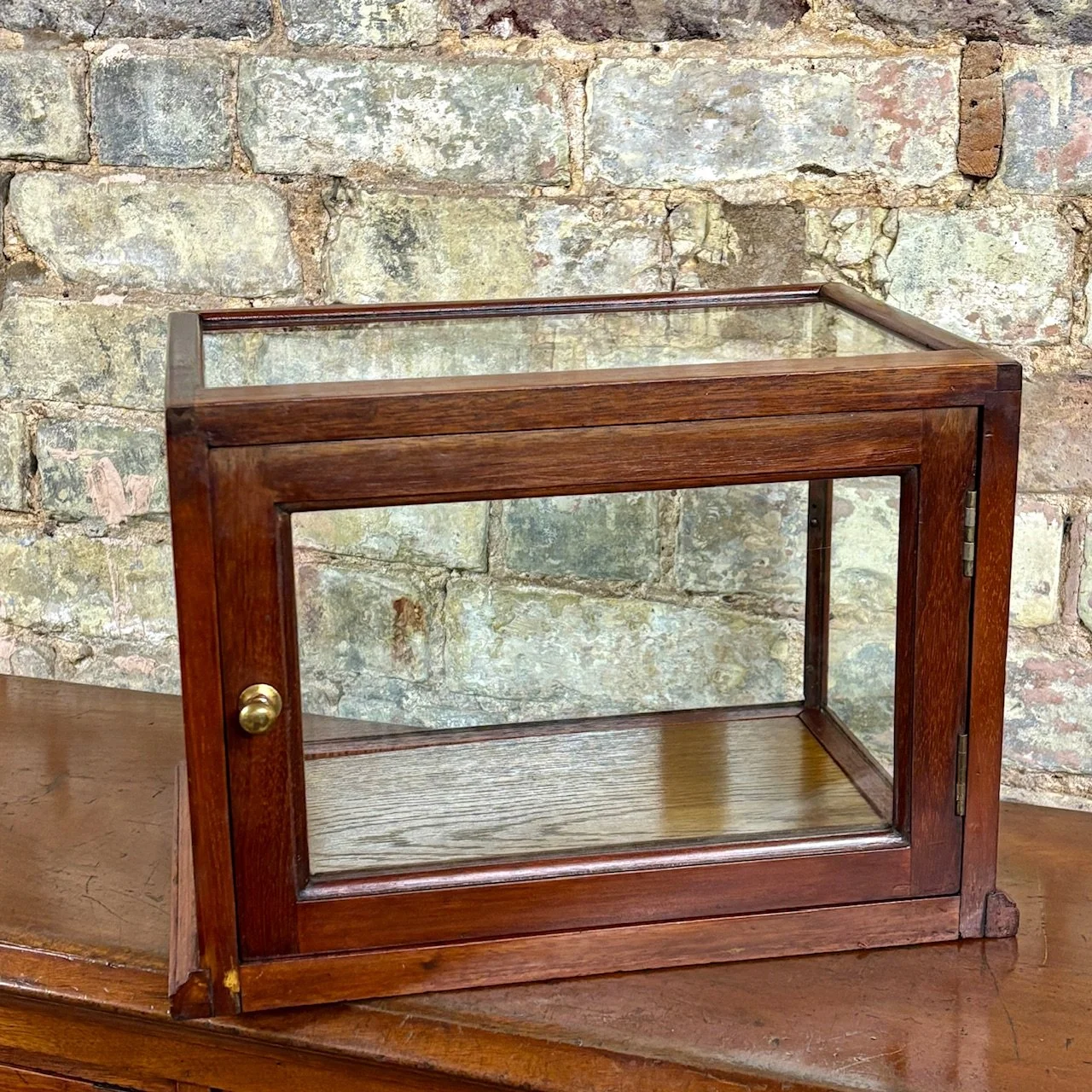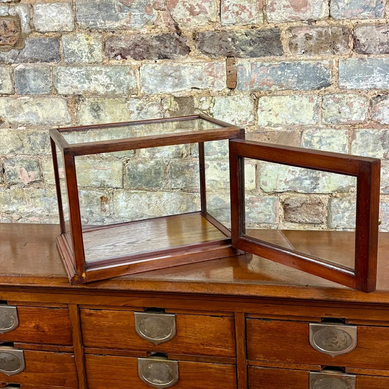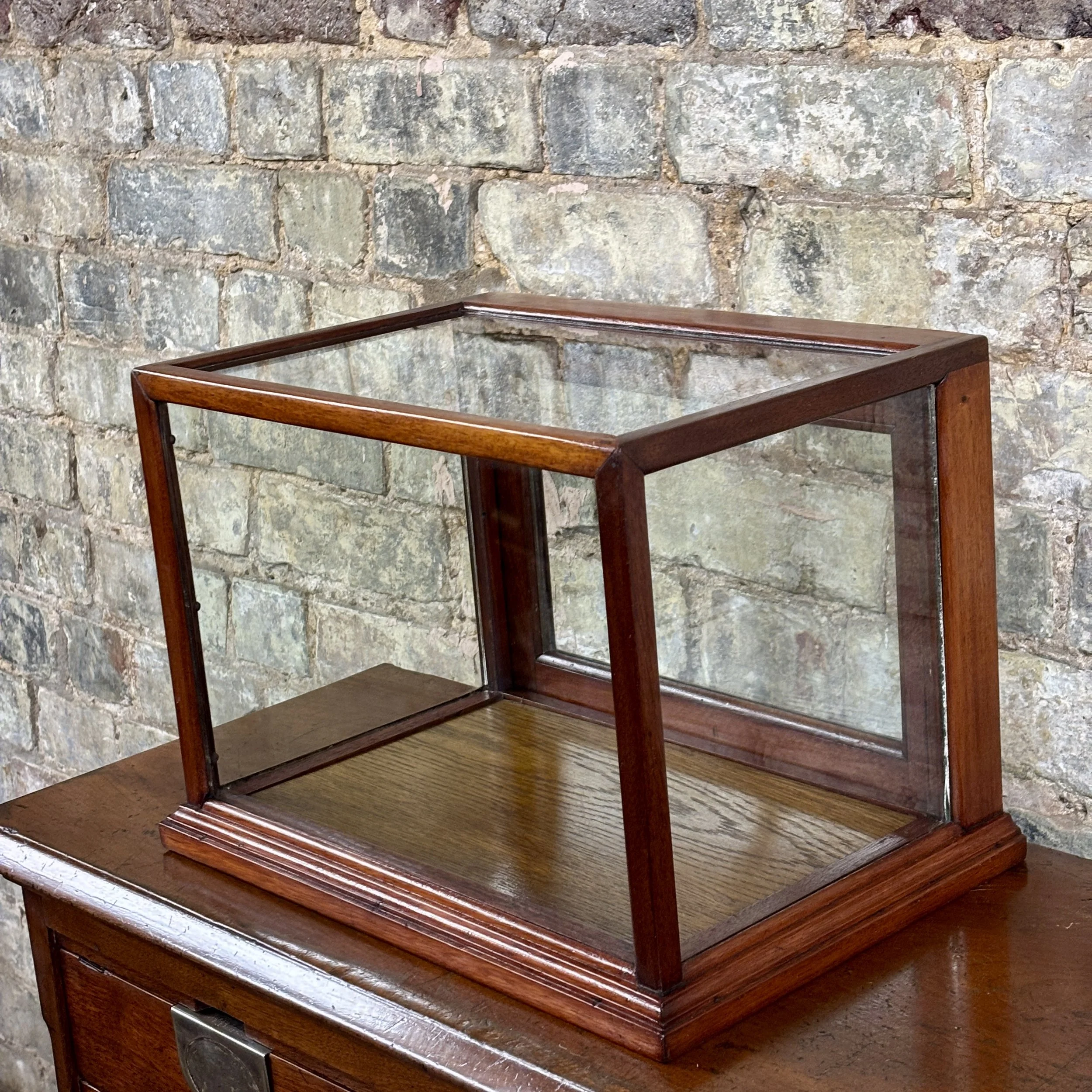 Beautifully constructed with a solid mahogany frame and single glazed panels on all sides, including the top, allowing for excellent visibility of displayed items. The cabinet opens at the rear via a hinged door with a brass knob. Originally used in a apothecary’s shop to display medicines or fine goods. Perfect for showcasing small collectables, jewellery, or curios in a home or retail setting.